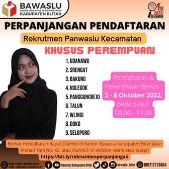 Kabupaten Blitar membuka perpanjangan pendaftaran calon anggota Panwaslu Kecamatan untuk
